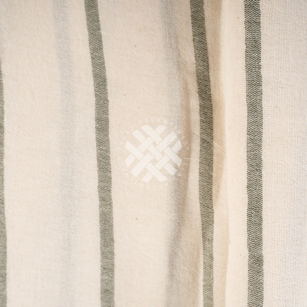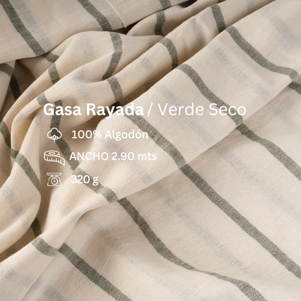 Nuestra Gasa es un tejido suave, fluido y vaporoso. Fabricado con fibras naturales de algodón. Aporta luminosidad y sotisficación. Es versátil y funcional. Tiene un efecto ligeramente arrugado y un diseño a rayas.