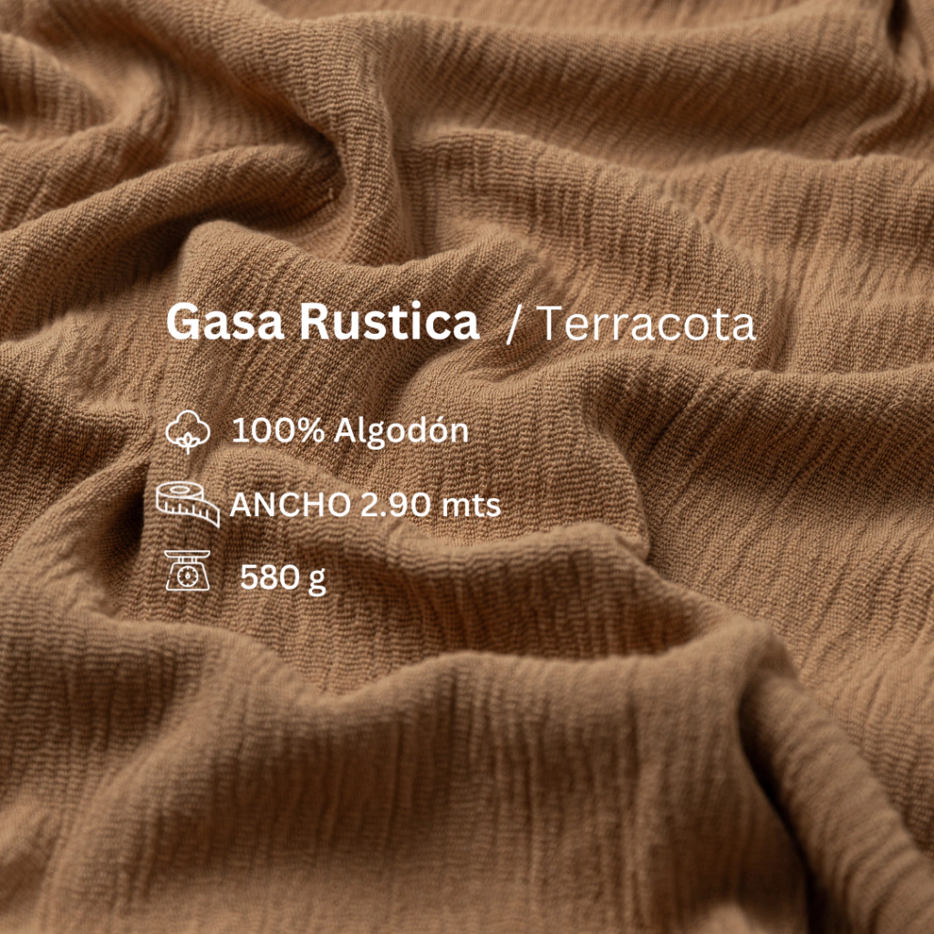 Nuestra Gasa rústica es un tejido de trama gruesa. Se destacada por su caída pesada. Tejida con fibras naturales de algodón, tiene un apariencia más rústica. Es versátil y resistente.