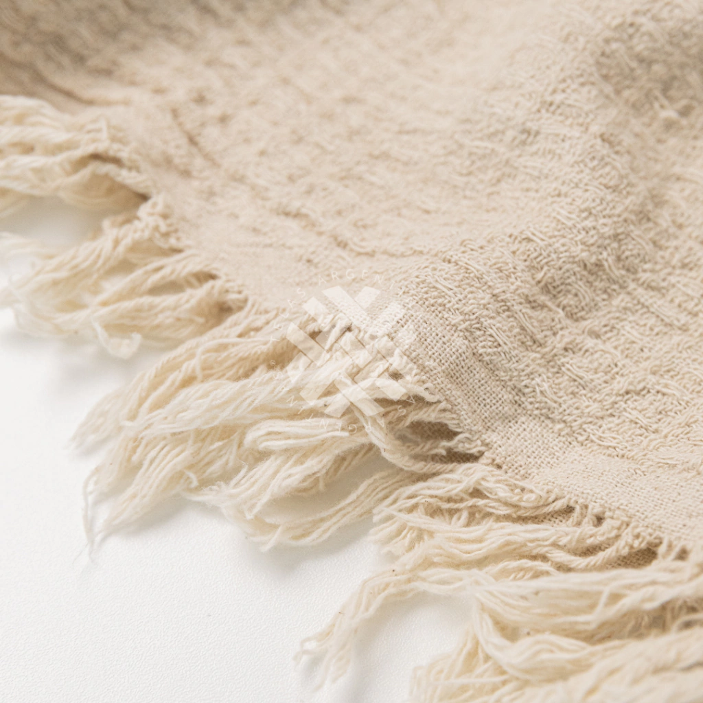 Nuestra manta se caracteriza por su suavidad, volumen y durabilidad. Es un tejido de fibras de algodón, cond etalles de flecos en los laterales. Muy utilizada en la decoración.