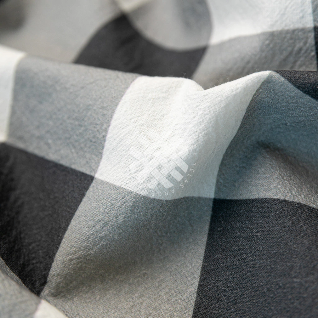 Nuestro Tusor es un tejido resistente y duradero. Fabricado con fibras naturales de algodón. Aporta suavidad y firmeza. Es versátil y funcional. Tiene un efecto ligeramente arrugado y un diseño a cuadros estampados que es última tendencia.
